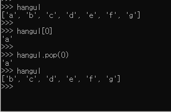 hangul.pop(0) 의 형식으로 하면 삭제된 요소를 반환 한다