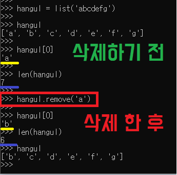 삭제하기 전과 후 의 길이도 변화 한것을 알 수 있습니다.