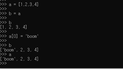 a 리스트를 b 리스트에 할당한후 a의 가장 처음 요소를 'boom' 으로 바꿨더니