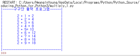 print('| 2 * 1 =',2*1,' |') 이와 같이 '' 작은따옴표로 묶여있습니다.