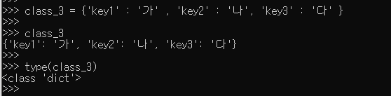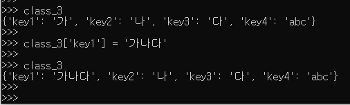 class_3['key4'] = 'abc' 이 부분이 class_3 딕셔너리에 키 : key4 값 : abc 를 넣어주는 부분이다