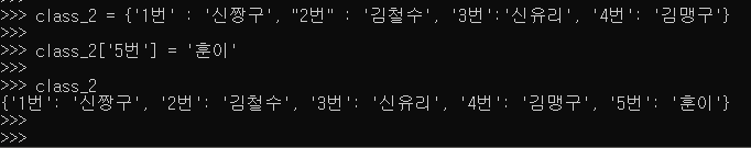 1반 딕셔너리 : class_1 = { 1 : '김코딩' , 2 : '강코딩' , 3 : '최코딩', 4 : '황코딩'}