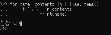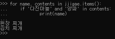 for 문을 가지고 jjigae 딕셔너리의 items 중에서 '두부'와 일치하는 항목을 출력하였다.