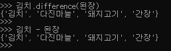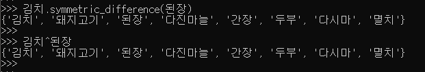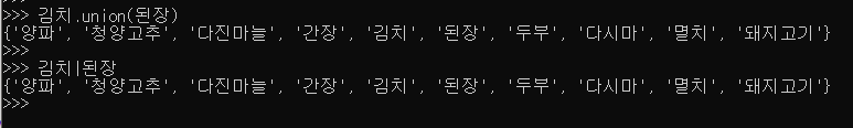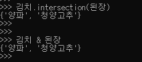 김치와 된장의 합집합을 구해보았다 중복되는 값이 없이 나온걸 확인 할 수 있다