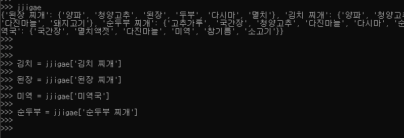 함수를 이용하기 전에 jjigae 딕셔너리의 항목들을 set 형태로 바꾸어 준다