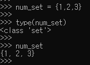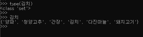 { } 중괄호 안에 , 쉼표로 구분한 항목을 써서 set 셋 을 생성하였습니다