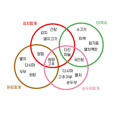 김치에서 된장의 겹치는 부분을 제외한 재료들만 나왔다