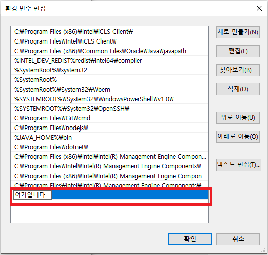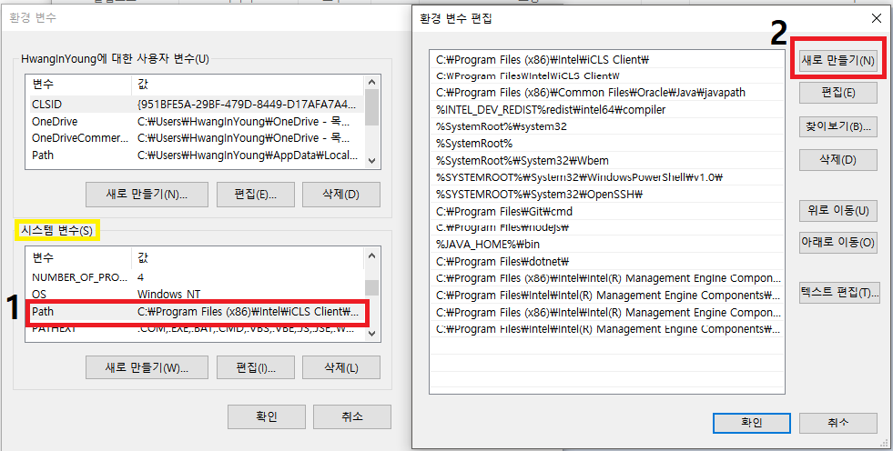 위의 두가지 방법 중 아무거나 선택하셔서 "환경 변수편집 창" 이 나오면 됩니다.