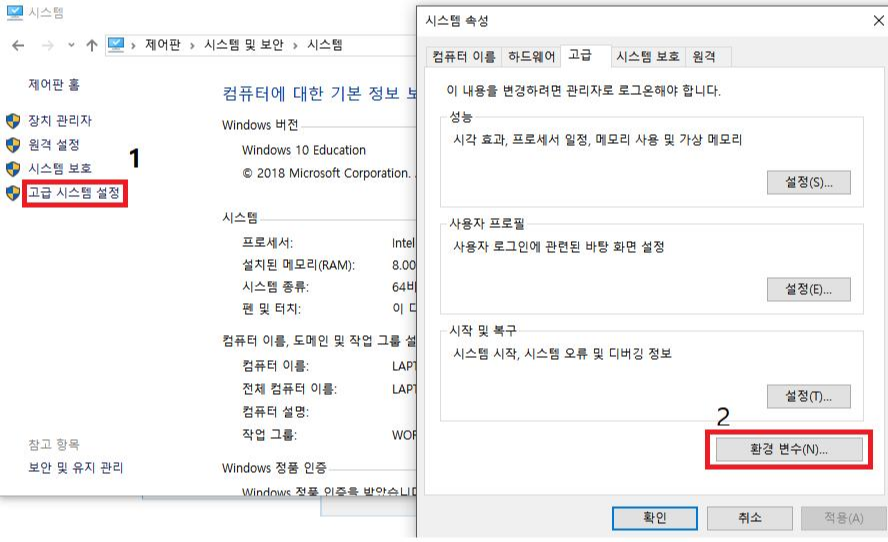 제어판 -> 시스템 및 보안 -> 고급 시스템 설정 -> 고급 탭(자동으로 선택됨)