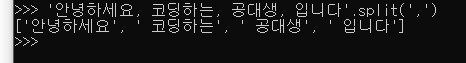'안녕하세요, 코딩하는 공대생, 입니다'.split(',')